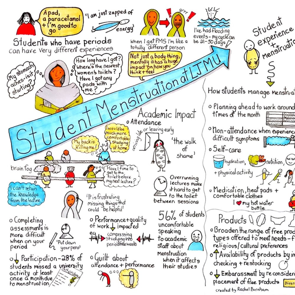 At Liverpool John Moores University, we wanted to explore students' experiences of menstruation and examine how it influences their attendance, participation, and overall wellbeing when on campus. Working in partnership with three student co-researchers, we used a combination of an online survey and semi-structured interviews to collect data from current students across the university. We identified not only the ways in which menstruation impacts students but also suggestions for fostering a more inclusive and supportive approach to menstruation within higher education.